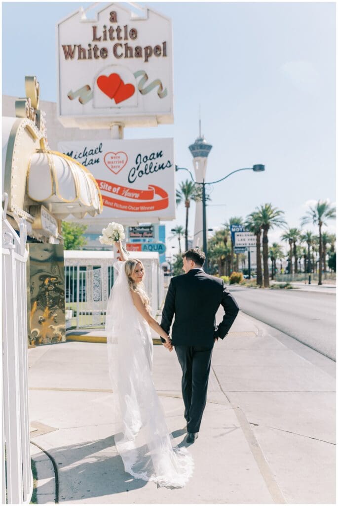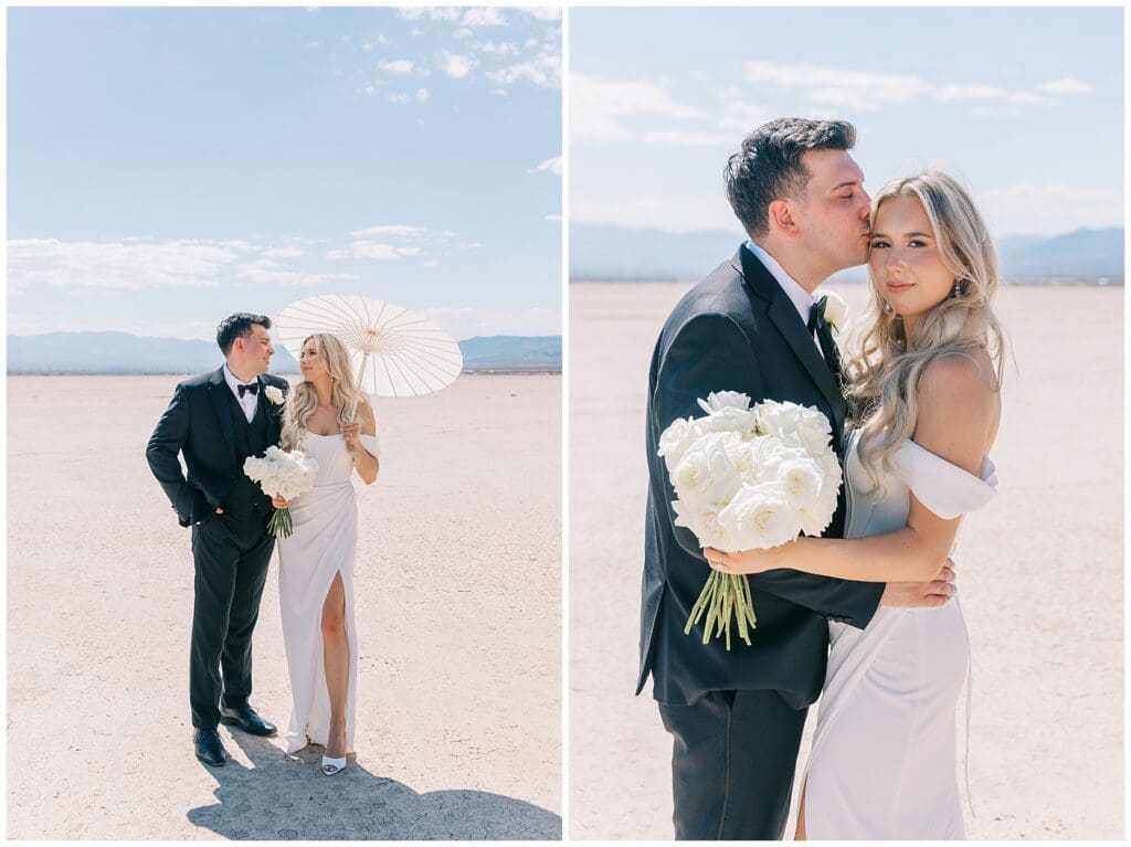 Sunny skies might sound like a photographer’s best friend, but too much sun can be tricky, especially during outdoor elopement sessions in Las Vegas. Next to the heat, the top challenge in summer is harsh sunlight. It creates hard shadows, causes people to squint, and makes photo editing more difficult. And during August, strong sunlight burns down for most of the day, bouncing off buildings and washing out key details in your photos if you’re not careful.